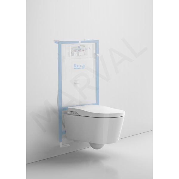 Smart toilet suspendido Roca Rimless®. Incluye tapa y asiento con funciones de lavado y secado. Necesita toma de red. Compatible con Sistemas de Instalación Roca Duplo One / Duplo S. Descarga dual 4,5/3L. Para su óptimo funcionamiento se recomienda realizar periódicamente las tareas de mantenimiento y limpieza con los productos consumibles compatibles (ver más abajo en Productos Consumibles Compatibles).