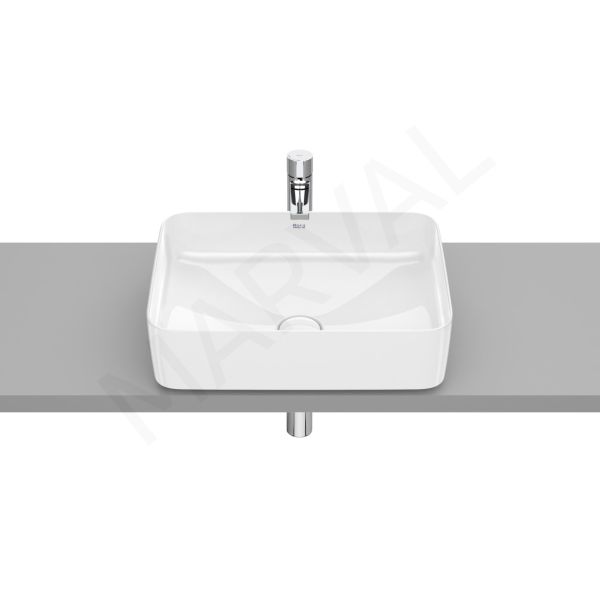 Lavabo de Fineceramic® de sobre encimera. No incluye grifería. Incluye desagüe universal con tapón fijo abierto cerámico de Ø72 mm.