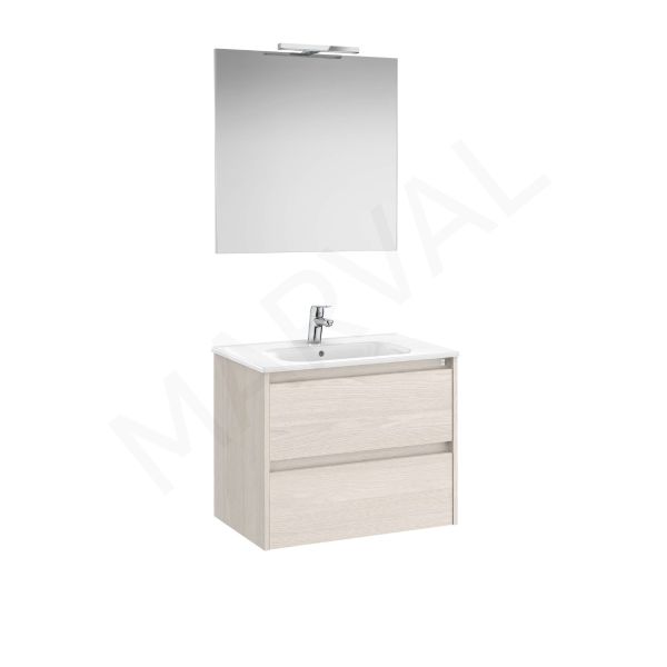 Pack - Conjunto de mueble base de tres cajones, patas, lavabo, espejo Victoria y aplique LED Starlight. No incluye grifería.