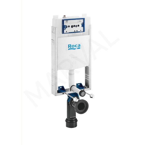 Bastidor con cisterna compacta empotrable con doble descarga para inodoro suspendido. Codo de Ø90 / Ø 110. Distancia axial de 180 y 230 mm. Profundidad mínima instalación de 90 mm. Montaje empotrado en pared resistente. Conexión hidráulica superior. A completar con una placa de accionamiento Roca compatible (no incluida).